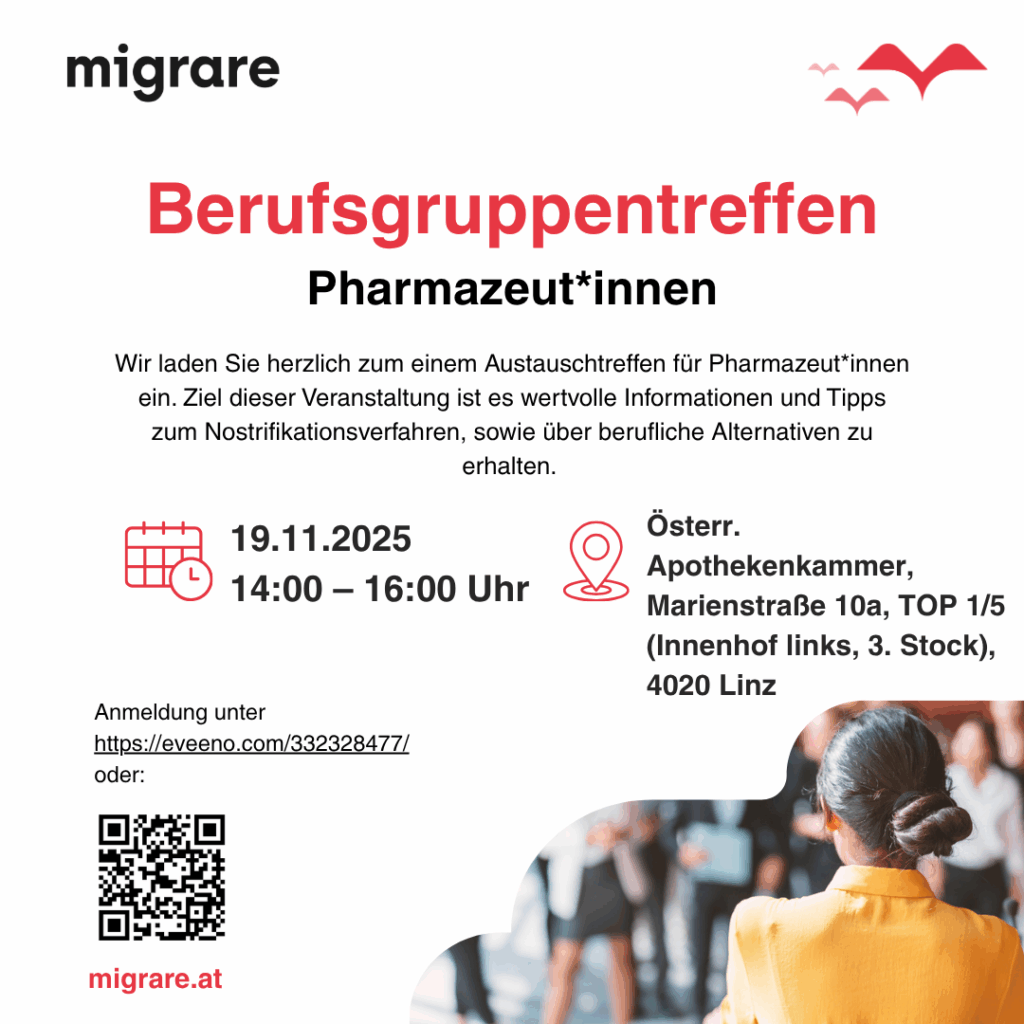Bitte melden Sie sich bis zum 17. September 2025 unter folgendem Link an:anmelden!Wir freuen uns auf Ihre Teilnahme und stehen Ihnen für weitere Fragen gerne telefonisch unter der Telefonnummer: 0732/667363-316 oder 0732/667363-899 oder unter ast.oberoesterreich@migrare.at zur Verfügung!