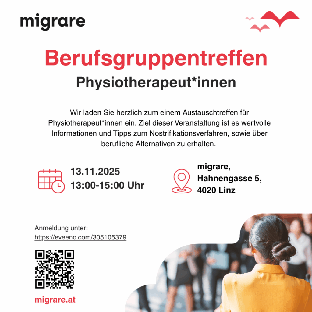 Bitte melden Sie sich bis zum 11. November 2025 unter folgendem Link an: hier anmelden!Wir freuen uns auf Ihre Teilnahme und stehen Ihnen für weitere Fragen gerne telefonisch unter der Telefonnummer: 0732/667363-316 oder 0732/667363-899 oder unter ast.oberoesterreich@migrare.at zur Verfügung!