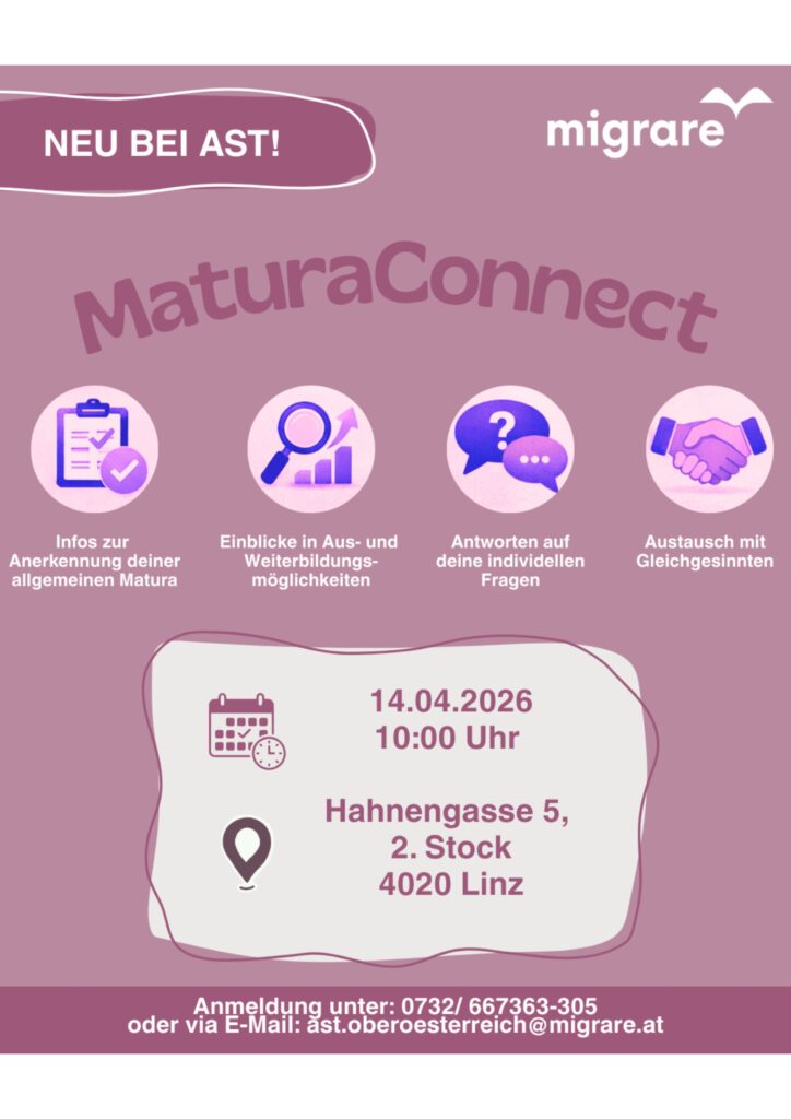 Anmeldung unter: 0732/667363305 oder via E-Mail: ast.oberoesterreich@migrare.at